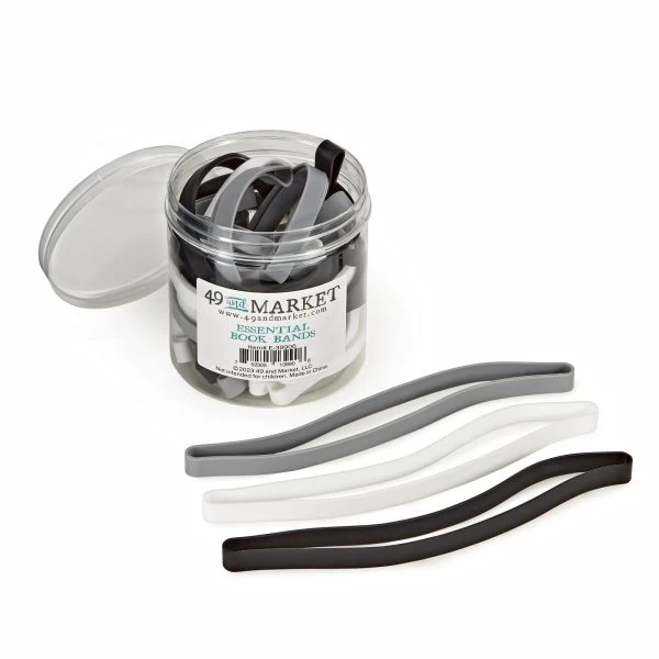 49 And Market Essential Book Bands Neutral 24/Pkg – Book Bands are a fun add to keep mini albums and junk journals closed. They can also be used with our Create-An-Album Covers for easier display. Jar contains a total of 24 super wide bands (8 white, 8 grey and 8 black). Bands are approximately 0.5 inches wide by 8 inches long. They can be stretched to fit a variety of album sizes. Imported.