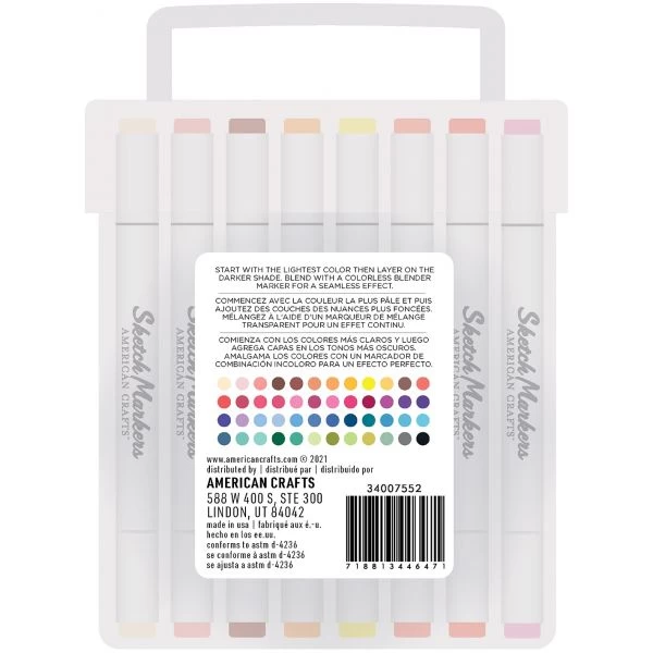 AC Sketch Markers Dual-Tip Alcohol Markers 48/Pkg – Draw, color, and create with Sketch Markers by American Crafts. Each one features a wide chisel tip and a small fine tip for projects large and small. Quick drying, waterproof ink is also transparent, which makes these great for layering techniques. Use them for drawing, sketching, crafting, and more. This package includes 48 Sketch Markers in a rainbow of bright colors. Imported.