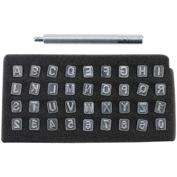 Alphabet & Number Stamp Set .25″ – Leathercraft Tools-Alphabet & Number Stamp Set. The perfect stamp for leather! This package contains thirty-five 1/4 inch stamp heads and one handle. Imported.