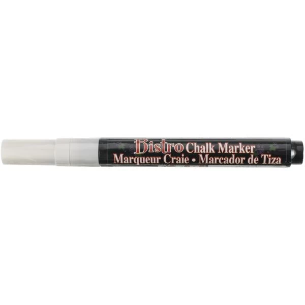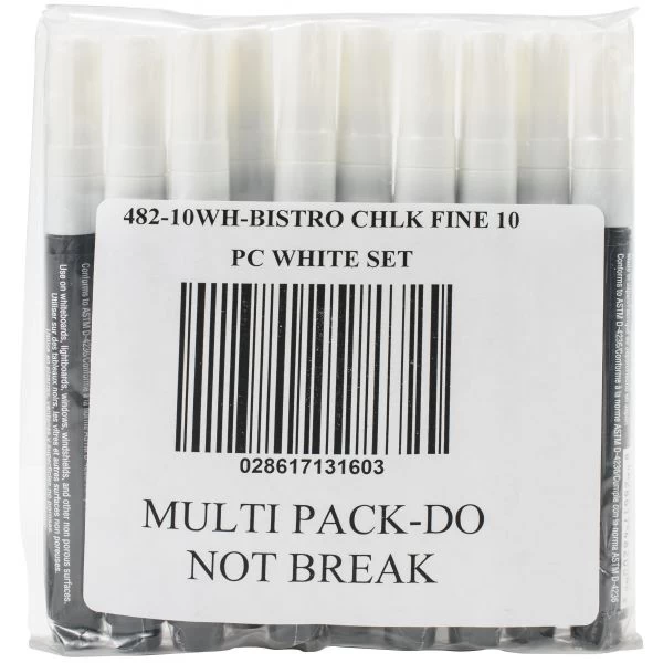 Bistro Chalk Marker Fine Point 10/Pkg – A water-based chalk paint that is pigmented for use on chalkboards, light boards, glass, mirrors, dry erase and most non-porous surfaces. This package contains ten 5 inch long fine point chalk markers. Conforms to ASTM D 4236. Imported.