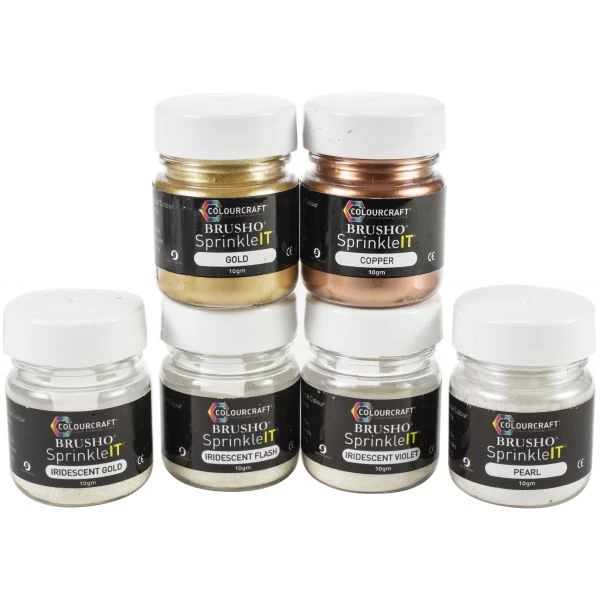Brusho SprinkleIT 10g Set 6/Pkg – Simply sprinkle it over Brusho Crystal Colour and then, once spritzed with water, it will create amazing effects. It sparkles and shimmers. Ideal for use on canvases, greeting cards, mixed media and more! This 4.375x3x2 inch package contains six 10g containers of sprinkles in assorted colors. Imported.