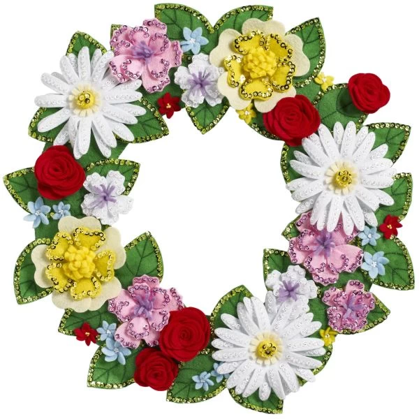 Bucilla Felt Wreath Applique Kit 17″ Round – This kit lets you create a fun and beautiful holiday design. This package contains stamped felts, cotton floss, color separated sequins and beads, needles and instructions. Design size: 17 inch round wreath. Design: Spring Wreath. Made in USA.