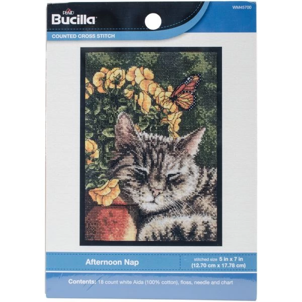 Bucilla Mini Counted Cross Stitch Kit 5″X7″ – A fantastic image that has been adapted from artwork just for cross-stitch! This package contains 18-count white Aida cloth, cotton embroidery floss, needle, trilingual instructions and chart. Design: Afternoon Nap. Design measurements: 5×7 inches. Artist: Marilyn Barkhouse. Made in USA.