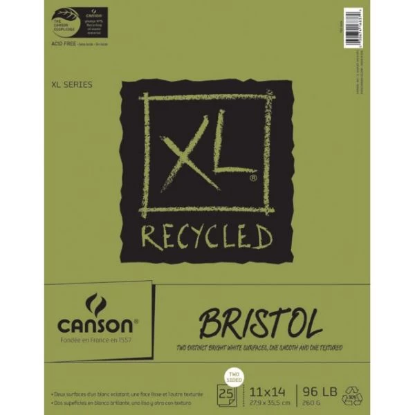 Canson XL Recycled Bristol Paper Pad 11″X14″ – CANSON-XL Recycled Bristol Pad. This paper pad features two distinct bright white surfaces: one smooth and one textured. Bristol board accepts many types of media. This package contains one 14×11 inch recycled Bristol pad with twenty-five double-sided sheets. Acid free. Made in USA.