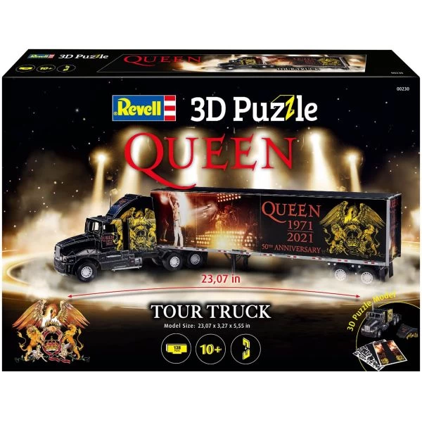 Carrera-Revell 3D Puzzle – In 50 years of band history, Queen created some of the most famous rock anthems in music history and sold an incredible 200 million albums. Even 30 years after the death of its charismatic frontman Freddie Mercury Queen continues to live on with the remaining band members Brian May and Roger Taylor. In keeping with the 50th anniversary of the band, fans can now add a 128-piece 3D puzzle of a truck with the design of the legendary Britons to their collection. This package contains 128 pieces to create the Queen Tour Truck 3D Puzzle. Model size 23.07×3.27×5.55 inches. Recommended ages ten years and up. Imported.