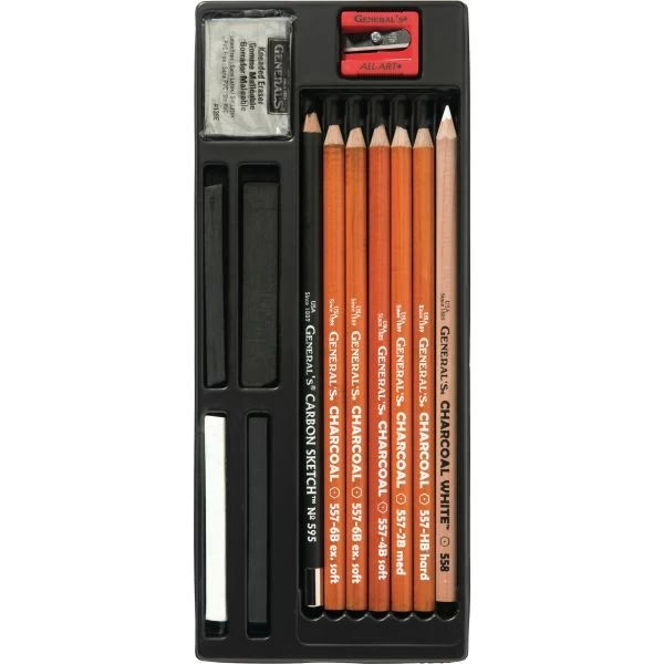 Charcoal Kit 11pcs – GENERAL PENCIL-The Original Charcoal Drawing Kit. This kit comes with a White Charcoal Pencil, five Black Charcoal Pencils, two Black Charcoal Sticks, a White Charcoal Stick, a Black Wide Charcoal Stick, a Carbon Sketch Pencil, a kneaded eraser and a sharpener. Made in USA.
