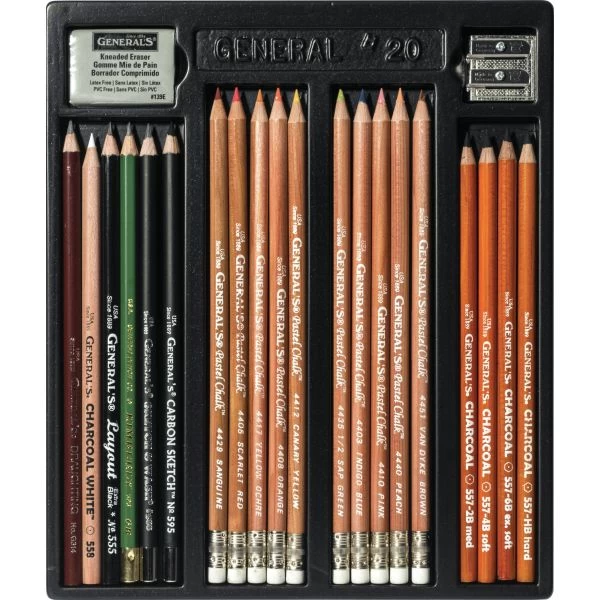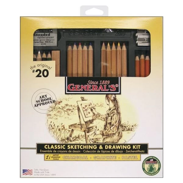 Classic Sketching & Drawing Kit – GENERAL PENCIL-Classic Drawing & Sketching Kit. This kit includes ten Pastel Chalk Pencils, four Charcoal Pencils, one Flat Sketching Pencil, one Layout Pencil, one Kimberly Drawing Pencil, one Sketch & Wash Pencil, one Kneaded Eraser, one Metal Sharpener and one Draughting Pencil. Made in USA.