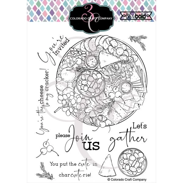 Colorado Craft Company Clear Stamps 6″X8″ – Serve up some delightful creations with the Charcuterie Board Clear Photopolymer Stamp Set from the Big and Bold Collection by Colorado Craft Company. The set includes clear photopolymer stamps with a large and beautifully arranged, round charcuterie board and smaller images of cherries, two pieces of fresh rosemary, a cheese wedge and a small bowl of nuts. This 6.5 x 10 inch package includes the Charcuterie Board stamp set measuring 6 x 8 inches. It includes 11 stamps: 6 images and 5 sentiments. The largest stamp is 4.75 x 5 inches and the smallest stamp is 1 x 0.8 inches. The stamps can be used with the coordinating Charcuterie Board die set sold separately (BB564-D). Sentiments included in the set: You’re invited, You’re the cheese to my cracker, please join us, Let’s gather and You put the cute in charcuterie. Made in the USA.