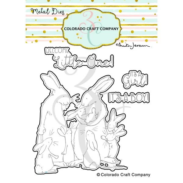 Colorado Craft Company Metal Die Set – Welcome the newest addition to any family with the New Baby Dies featuring the illustrations of Anita Jeram for Colorado Craft Company! The 4 x 6 inch package includes four thin metal dies that are compatible with most die cutting machines and coordinate with their New Baby stamp set (AJ432- sold separately). The largest die is 3.25 x 3.5 inches and the smallest die is 0.87 x 0.5 inches. This set includes one large die for the bunny family and 3 smaller dies for the sentiments: It’s a Boy, It’s a Girl, and Welcome Little One! All of Colorado Craft Company’s products are manufactured in the USA.