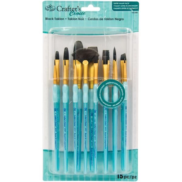Crafter’s Choice Black Taklon Brush Value Set – Crafter’s Choice brush sets offer a full range of must have craft brushes for all your crafting needs. This 15 piece set of black taklon paintbrushes includes one angular (size 3/8), two flats (sizes 1/4, 3/4), one wash (size 1/2), two oval washes (sizes 3/8, 3/4), two shaders (sizes 4, 8), two filberts (sizes 2, 6), three rounds (sizes 0, 2, 8), two liner (size 0), and one fan (size 4). Brushes also feature a No Slip rubber grip. Imported.