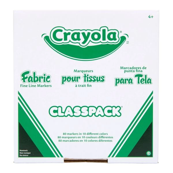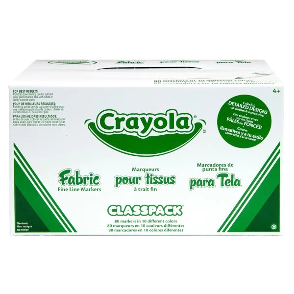 Crayola Fabric Markers – CRAYOLA-Design on fabric with 10 brilliant colors! Box includes 80 markers-8 each of 10 colors! Color are black, purple, red, royal blue, light blue, green, light green, yellow, red, orange, and brown. For best results, use on 50/50 cotton/polyester fabric. Place a piece of paper under the fabric to prevent bleed-through. Saturate the cloth with colors. Let items dry overnight. Before wearing or laundering, designs must be heat set. Non-Toxic. Made in USA.