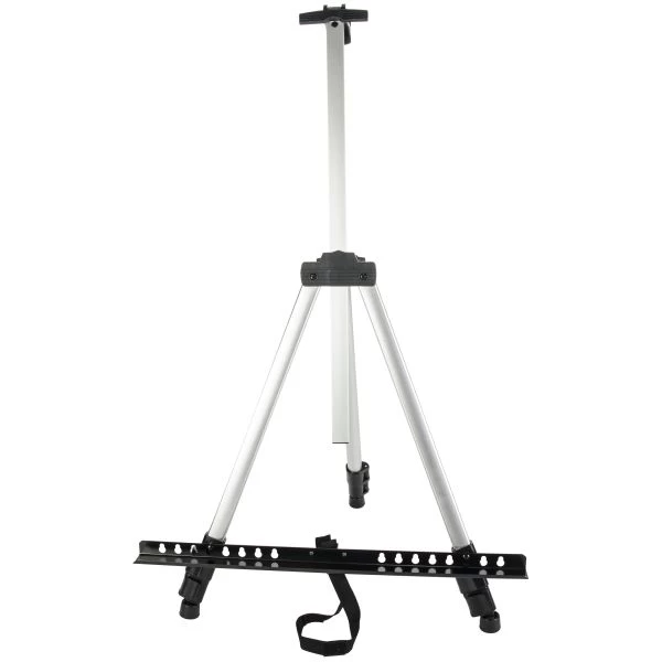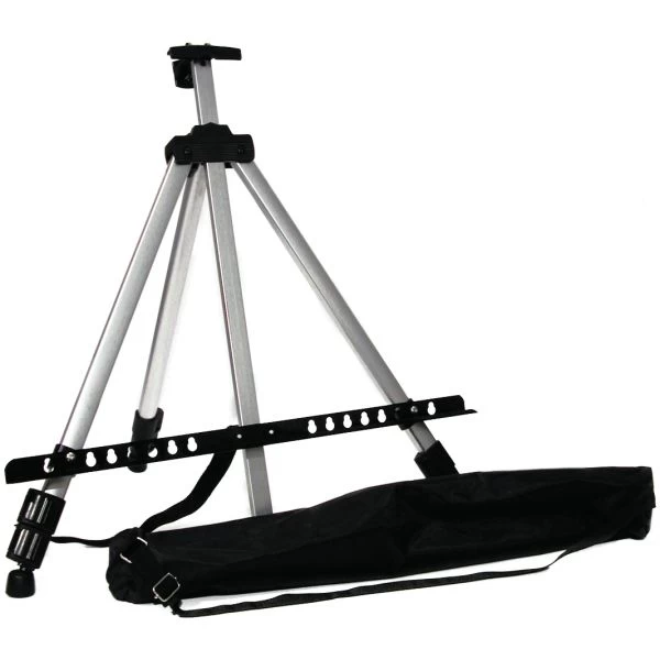 Deluxe Artist Aluminum Easel – This aluminum easel adjusts to accommodate pads and boards from 7 to 32 inches high and features three independent adjustable legs (17 to 46 inches) allowing you to easily use it on uneven surfaces, as well as in cramped quarters: going so far as allowing placement of one or two legs on a desk, table, bench, wall or other elevated surface and the remaining foot (feet) on the floor/ground. Canvas can be lowered as low as 30 inches from the floor, making it great for kids! Easel measures approximately 62x41x28 inches (folded: 4x24x3 inches) with its own carrying case. Imported.