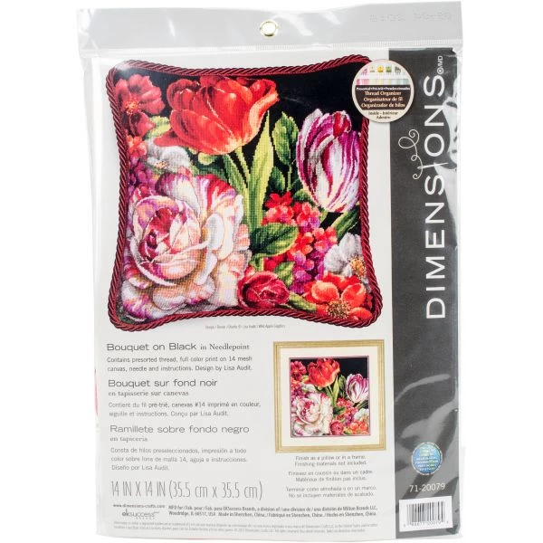 Dimensions Needlepoint Kit 14″X14″ – Dimensions-Needlepoint Kit. Gorgeous designs, vibrant colors, and the highest quality materials are all things that Dimensions brings to you in each of their needlework kits. This package contains one 14-mesh canvas with full-color print, presorted thread, one needle, and instructions. Design: Bouquet On Black. Finished size: 14×14 inches. Designer: Lisa Audit. Imported.