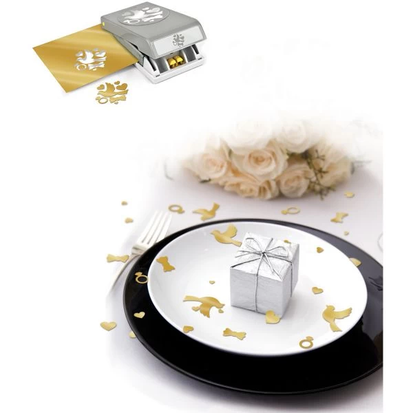 Double Punch – This double punch is two punches in one! These punches create gorgeous shapes and border art! They are easy to use and lock closed for simple and safe storage. This package contains one Double Punch: Wedding Confetti. Approximate size of punched pieces is between 0.25×0.25 inches and 1.125×1.125 inches. Imported.