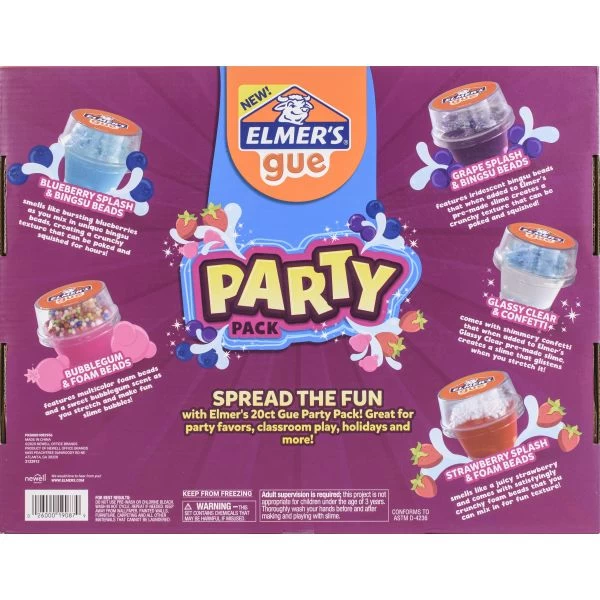 Elmer’s Premade Slime Party Pack W/Mix-Ins – Spread the fun with Elmer’s gue party pack! Great for party favors, classroom play, holidays and more! This package contains four each: 2oz blue clear slime (blueberry scent with bingsu beads, 2oz purple clear slime (grape scent) with bingsu beads, 2oz clear slime (unscented) with confetti, 2oz hot pink slime (bubblegum scent) with foam beads, and 2oz red slime (strawberry scent) with foam beads. Non-toxic. Conforms to ASTM D 4236. WARNING: Choking Hazard- small parts. Not for children under 3 years. Imported.