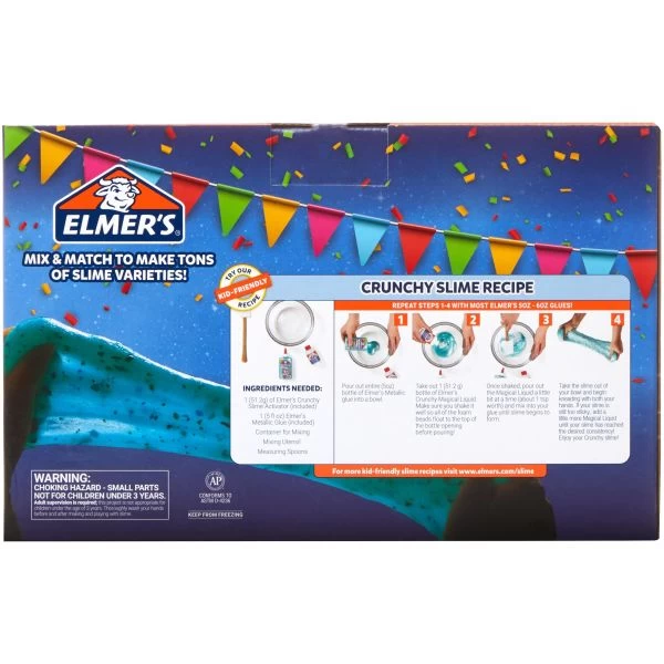 Elmer’s Slime Celebration Kit – Mix and match to make tones of slime varieties! Makes five unique slimes! This package contains 5oz of metallic glue, 5oz of glow in the dark glue, 5oz of color changing glue, 5oz of colored glue, 6oz of glitter glue, two 65g bottles of confetti slime activator, 65g of metallic slime activator, 65g of glow in the dark slime activator and 51.2g or crunchy slime activator. Conforms to ASTM D 4236. WARNING: Choking Hazard- small parts. Not for children under 3 years. Imported.