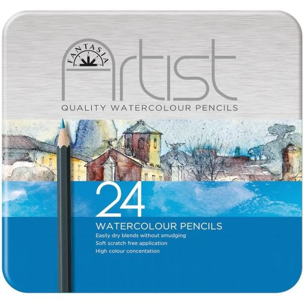 Fantasia Premium Watercolor Pencil Set 24/Pkg – Fantasia-Premium Watercolor Pencil Set. Produced with carefully selected pigments to obtain high color concentration and give depth to colors. Different colors can be blended together to obtain different tones & effects. In addition to paper, these pencils are suitable for use on a variety of different materials like wood, fabric and board. This package contains twenty-four watercolor pencils in an assortment of colors within one 7- 1/4x4x1/2 inch tin case. Conforms to ASTM D 4236. Imported.