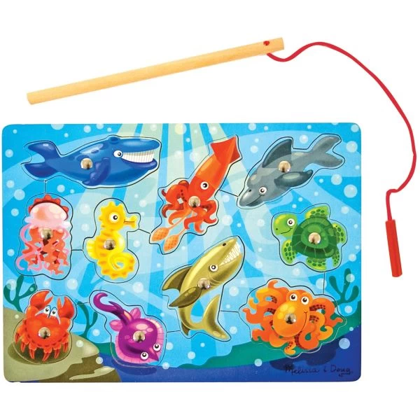 Fishing Magnetic Puzzle Game – The ultimate catch-and-release fishing program, this magnetic wooden puzzle game features aquatic animal artwork. Use the magnetic fishing pole to catch the 10 colorful sea friends from the game board, then enjoy the challenge of returning them to the depths! A creative way to encourage hand-eye coordination and fine motor skills. This 8.5×0.4×11.6 inch package contains one puzzle board, ten magnetic puzzle pieces and one fishing rod. Imported.