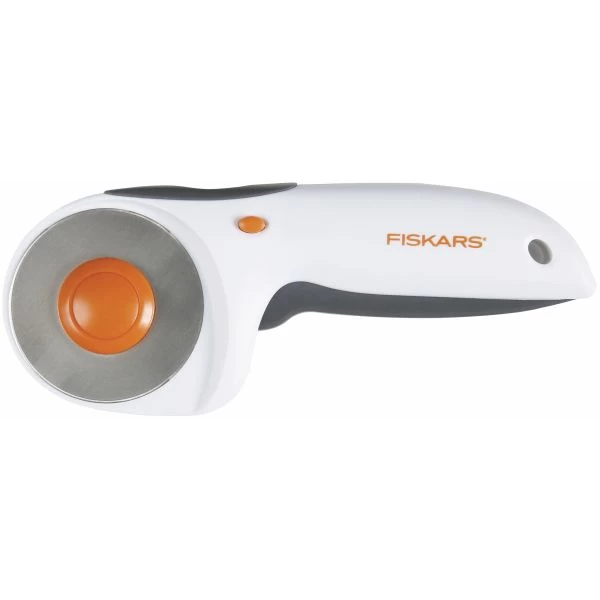 Fiskars Comfort Grip Rotary Cutter 60mm – FISKARS-Comfort Grip Rotary Cutter. 60mm, 6-3/4 long. Lightweight. Comfort grip rotary cutter with extra long contour handle and soft grip finger rest works naturally with your hand for ultimate comfort and safety for hours of cutting. Cutter features: Sharp, long-lasting 3-step easy-to-change blade, open blade cove, safety lock and engagement lock, right- or left-handed, easy spring action trigger, hole for hanging, and the improved view of the blade lets you see what you are cutting. Caution: Sharp Blade. Contact may result in injury. Handle with care and keep out of reach of children.