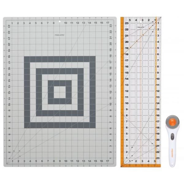 Fiskars Rotary Cutting Set 45mm – Everything you need to start quilting! Fiskars has created a convenient sewing and quilting tool set. Whether you are headed to quilting class, getting together with friends or leaving town for a relaxing weekend, this 3-in-1 combo is the perfect companion. This 19.5×26.25 inch package contains one 45mm rotary cutter, one 18×24 inch cutting mat and one 6.5×24.5 inch acrylic ruler. WARNING: Cut Hazard, Sharp Blade. Contact may result in injury. Always keep blades away from fingers and body. Handle with Care. Keep out of reach of children. Imported.