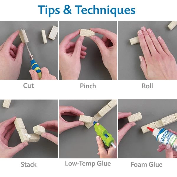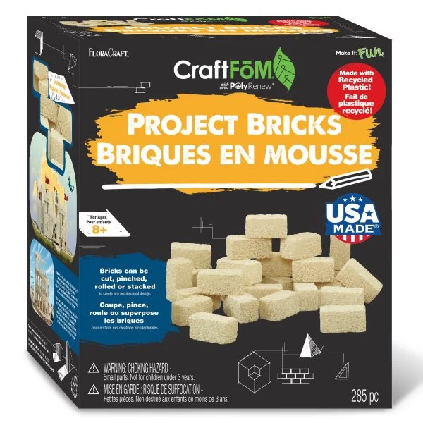 FloraCraft CraftFoM Project Bricks 285/Pkg – Create authentic-looking buildings from classic landmarks to imaginative forts with foam Project Bricks. You can assemble them in a variety of ways and cut them to any size or shape you desire. You can also combine them with other elements<BR>- like a craft stick roof, faux trees and bushes or a legion of Roman centurions<BR>- to create a realistic environment ideal for play or display<BR>- Plus, CraftFoM is made from recycled plastic. This package contains one 285-piece foam Project Bricks in tan. Made in the USA.
