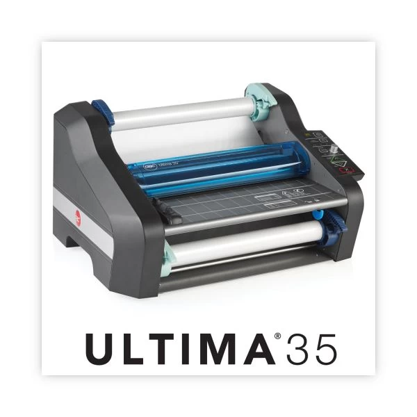 GBC Ultima 35 EZload Thermal Roll Laminator, 12″ Max Document Width, 5 mil Max Document Thickness – Thermal roll laminator with unique EZLoad roll film is simple to use, fast and flexible. Ideal for broad-based applications in any size school, office or small business center. The RollSeal Ultima 35 EZload bridges the gap between pouch laminating and traditional roll laminators by offering a 12 roll laminator with a unique EZload Roll Film System. Load your film fast and mistake-free every time. Laminates widths up to 12″ and all lengths. Laminator offers auto shutoff after one hour of nonuse and integrated trimmer so no more searching for scissors. Runs NAP II film with 1.7 mil to 10 mil thickness. Offers variable temperature, one-minute, warm-up time, and fixed speed of 3′ per minute. Weighs 35.2 lb.”