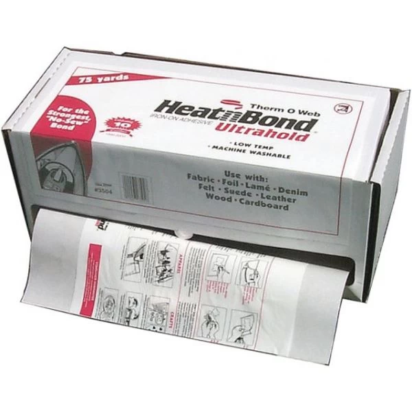 HeatnBond Ultrahold Iron-On Adhesive – HeatnBond Ultrahold Iron-On Adhesive. This adhesive is a paper backed sheet of solid heat activated adhesive. It uses a low temperature and short pressing time so it allows for a wider range of materials that can be bonded. There is no steam or pressing cloth needed. Will not lift or pucker after washing. Its no-sew bond is three times stronger than any other traditional fusible web. This package contains one 75yd bolt of 17in wide adhesive. Made in USA.