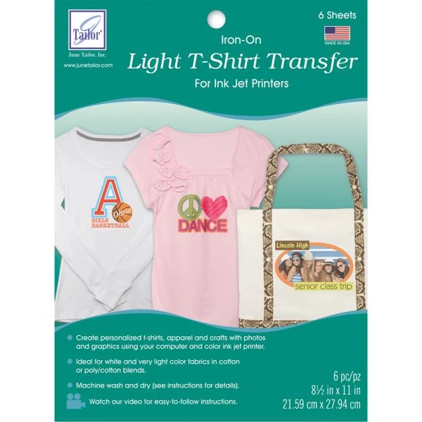 June Tailor Iron-On Ink Jet Transfer Sheets 8.5″X11″ 6/Pkg – June Tailor-Light T Shirt Iron On Ink Jet Transfer Sheets. Great for personalizing gifts for friends and family or just for keeping. Create any image using photographs, graphics or text on a computer and print on the transfer using a home ink jet printer. Completed projects are machine washable. Designed specifically for use on white or very light colored 100% cotton fabric. This package contains six 11×8-1/2 inch iron-on ink jet transfer sheets. Made in USA.