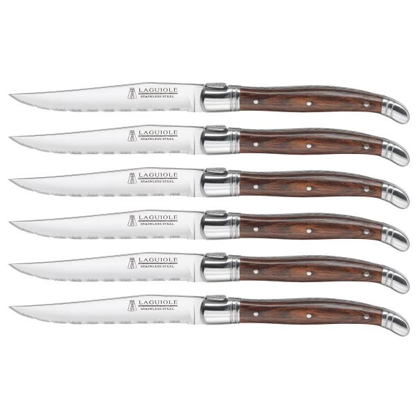Laguiole Wood Handle Steak Knives Set Of 6 – This beautiful steak knife set features forged stainless steel blades and exotic pakka wood handles, finished by hand. This package contains six serrated edged steak knives. Imported.