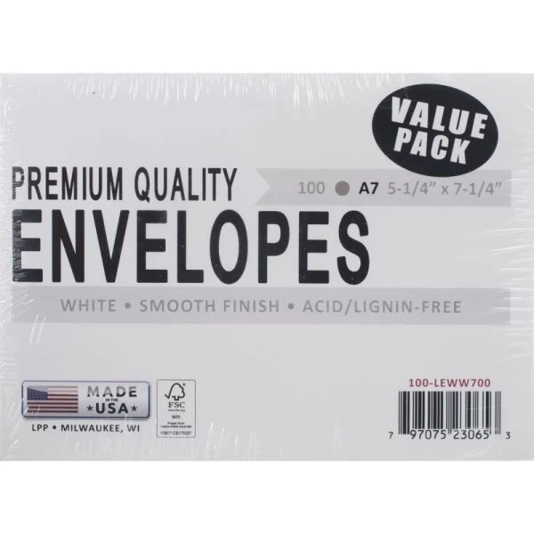 Leader A7 Envelopes (5.25″X7.25″) 100/Pkg – LEADER PAPER PRODUCTS-A7 Envelopes include 100 envelopes in each package. Color: White. Size: 5-1/4 x 7-1/4.