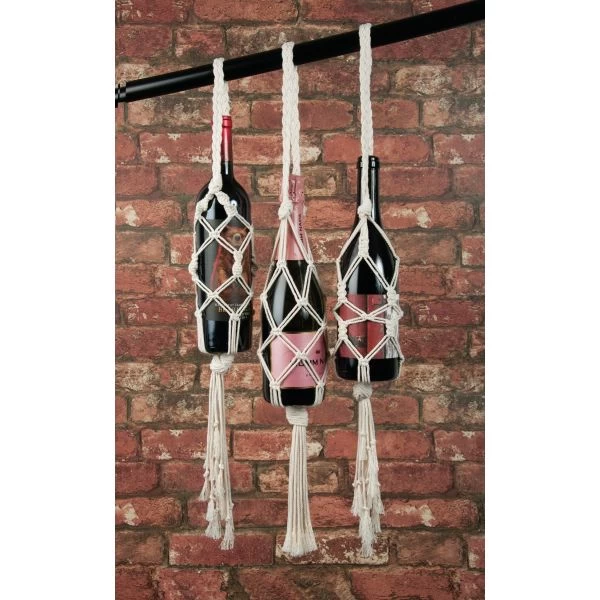 Macrame Bottle Bags Kit – Easily make your own, re-usable gift bags for bottles. This kit has cord and instructions to make three different patterns of bags, each sized to hold most 750ml beverage bottles. This package contains cotton cording and illustrated instructions. Approximate finished size: 4×27 inches. Imported.