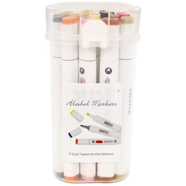 Nuvo Alcohol Markers 12/Pkg – The alcohol-based Nuvo Marker Pens come in brilliantly vibrant colors and are ideal for blending with similar shades or use alongside the Blending Pen to create gradients and other stunning effects. The dual-tip of each pen contains both fine detail and a chisel nib, making them a superb option for coloring stamped images. The tapered body ensures a comfortable hold with either the thick or thin end, allowing you to use it with optimum creative results.