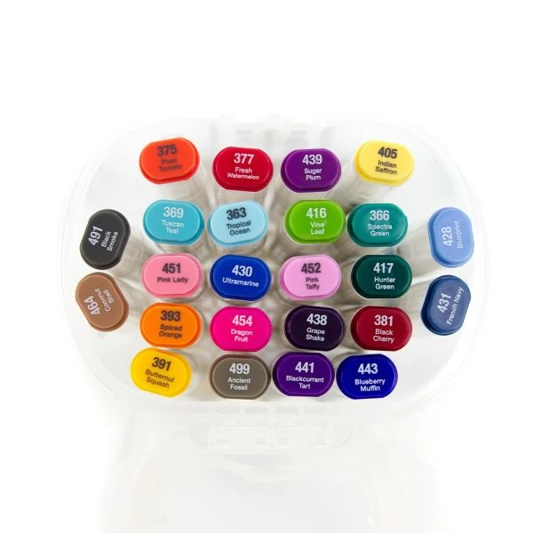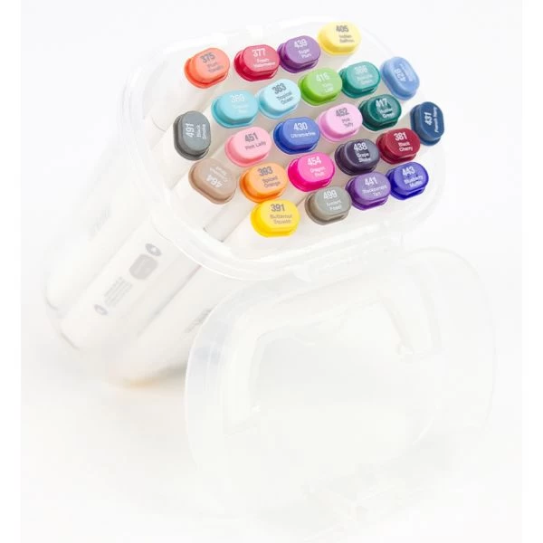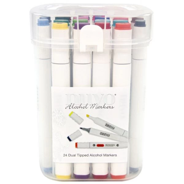 Nuvo Alcohol Markers 24/Pkg – The alcohol-based Nuvo Marker Pens come in brilliantly vibrant colors and are ideal for blending with similar shades or use alongside the Blending Pen to create gradients and other stunning effects. The dual-tip of each pen contains both fine detail and a chisel nib, making them a superb option for coloring stamped images. The tapered body ensures a comfortable hold with either the thick or thin end, allowing you to use it with optimum creative results.