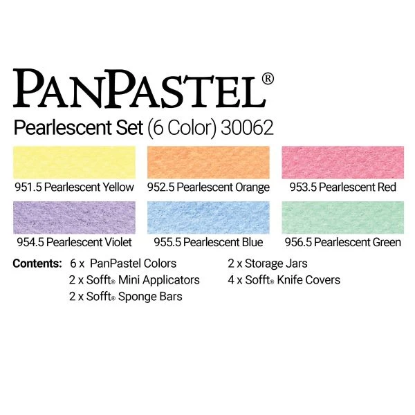 PanPastel Ultra Soft Artist Pastel Set 9ml 6/Pkg – Colorfin-PanPastel Pearlescent Artist Pastels Set. PanPastel Colors are genuine artists’ quality pastels, uniquely packed in a pan format. They were developed so that artists can easily lift, apply, and control pastel color-just like true painting! The pan format holds the color like paint for easy application. Each PanPastel is loaded with the highest quality artists’ pigments and have a rich, ultra- soft and low dust formulation. All of the professional- quality colors have excellent light-fastness, are fully erasable, and compatible with traditional pastel sticks, surfaces, conventional fixatives and other artists’ colors. This package contains six 9ml/0.30oz pearlescent artist pastels and eight Sofft tools in a storage jar. Conforms to ASTM D4236. WARNING: Cancer<BR>- www.P65Warnings.ca.gov