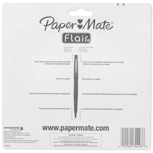 Paper Mate Flair Medium Felt Tip 12/Pkg – Paper Mate-Flair Medium Felt Tip: Fashion Assorted. These pens are quick-drying and ink will not bleed through paper while writing. This package contains twelve 5-1/2 inch long felt tip pens in assorted colors. Acid free. Imported.