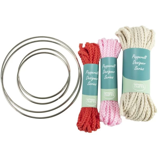 Pepperell Designer Series Macrame Dream Cathcer’s Kit – The joy of crafting is captured within the kit. As the maker you can proudly display your project because you brought it to life! All the materials and instructions are provided. Each kit comes complete (plant not included) ready to make, ready to hang! The modern dream catchers kit contains: 90 feet (27 meters) polypropylene cord, two 6 inch metal plated rings, two 4 inch metal plated rings and instructions. The kit contains enough material to create two dream catchers (one coral, one pink). Imported.