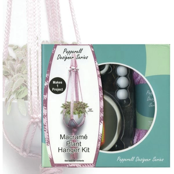 Pepperell Designer Series Macrame Plant Hanger Kit – The joy of crafting is captured within the kit. As the maker you can proudly display your project because you brought it to life! All the materials and instructions are provided. Each kit comes complete (plant not included), ready to make, ready to hang! The plant hanger kit contains: one white ceramic planter, one vinyl coated ceiling hook, 56 feet (17 meters) of pink polypropylene cord, four wooden beads, one metal plated ring and instructions. Imported.