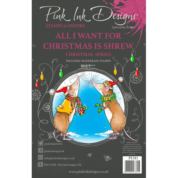 Pink Ink Designs 6″X8″ Clear Stamp Set – This A5 stamp set is part of the Christmas Series. These loving Shrews are full of Christmas cheer and are decking out for the festive season. They come with lots of additional elements so that you can create a fabulous festive scene. These stamps can be used with all sorts of medium including paper, card, mdf or fabric etc. You can spritz fabric with water after stamping, before heat sealing, to create lovely watercolor background washes. Ready to mount on an acrylic block the stamps can be used with ink pads, paint, or used with pigment and embossing powder. They are suitable for any other surface depending on the ink choice. Store flat away from heat and sunlight. Deep etched, quality photopolymer. Designed and made in the UK. A5 overall package dimension, 150mm x 210mm.