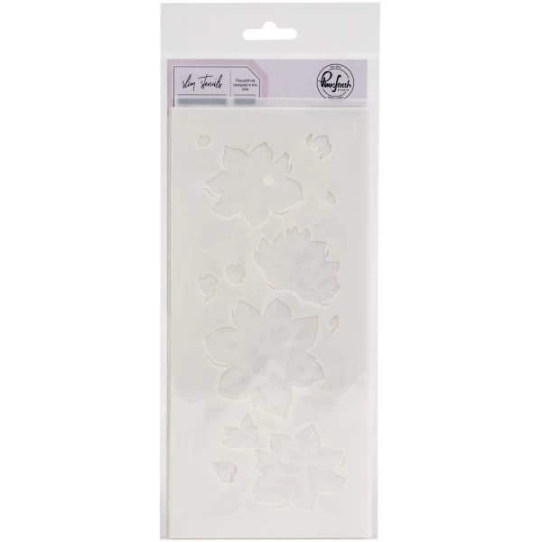 Pinkfresh Studio Slimline Stencils 4″X9″ 5/Pkg – 5 piece layering stencil set made to coordinate with the Heartfelt Thanks stamp set. There are three stencils to color the florals and two stencils to color the greenery. Use them without the stamped image for a soft, ink blended floral background. Use the clear stamp to add more detail to the image by stamping in detail black, or heat embossing in gold. Heartfelt Thanks stencils measure approximately 4 x 9 inches.