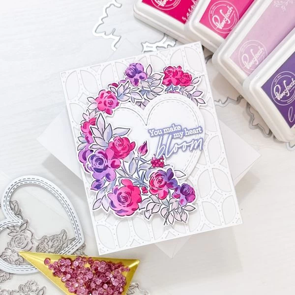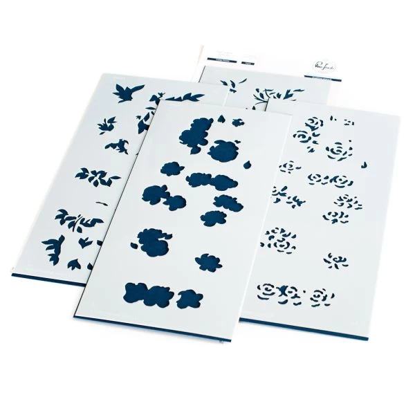 Pinkfresh Studio Stencils 4″X9″ 4/Pkg – 4 piece layering stencil set made to coordinate with the Indigo Roses stamp set, and Indigo Roses dies. There is a separate stencil for each layer, with guidelines on each stencil for perfect alignment to a 3.625×8.625 inch cardstock panel when using alone. When using the stencils with the stamped image you will forego the alignment guides, and instead align each layer to the stamped image. Use them without the stamped image for a soft, no-line coloring feel. Use the coordinating stamp to add more detail to the image by stamping with detail black, or heat embossing in your favorite powder for added shine. Imported.