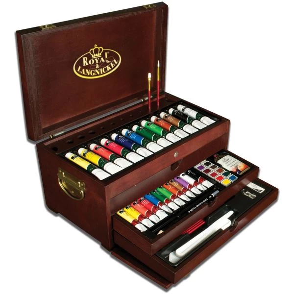 Premier Chest – ROYAL BRUSH-Royal & Langnickel: Artist Premier Painting Chest. This beautiful 80-piece set makes a great gift– weather for yourself or a fellow artist. Included are twelve tubes of oil paints (21mL each), twelve tubes of acrylic paints (12mL each), twelve tubes of watercolor paints (12mL each), twelve watercolor cakes, six gold Taklon brushes, six white Taklon brushes, six white bristle brushes, three palette knives, three Artist Guide Booklets (Acrylic, Oil, and Watercolor), two graphite pencils, one brush holder rack, one wooden palette (13-1/2×7 inches), one bottle of linseed oil, one sharpener, one white eraser. All pieces are housed in a 14×8-1/2×7 inch wood chest accented with leather-like straps and brass latches and handles. Conforms to ASTM D4236. Imported.