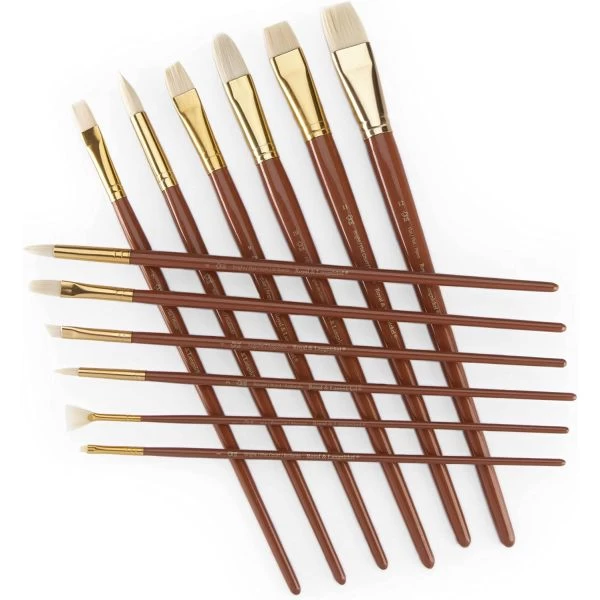 Royal Langnickel Bone Taklon Value Pack Brush Set – Royal Brush-Taklon Bone Value Pack Brush Set. This brush set is perfect for any artist! Ideal for acrylic and oil paints. This package contains three firm bone taklon brights brushes (sizes 1, 6, 11), two flat brushes (sizes 7, 12), two round brushes (sizes 3, 8), two angular brushes (sizes 4, 9), two filbert brushes (sizes 5, 10), and one fan brush (size 2) within one 14×6 inch zippered pouch. Imported.