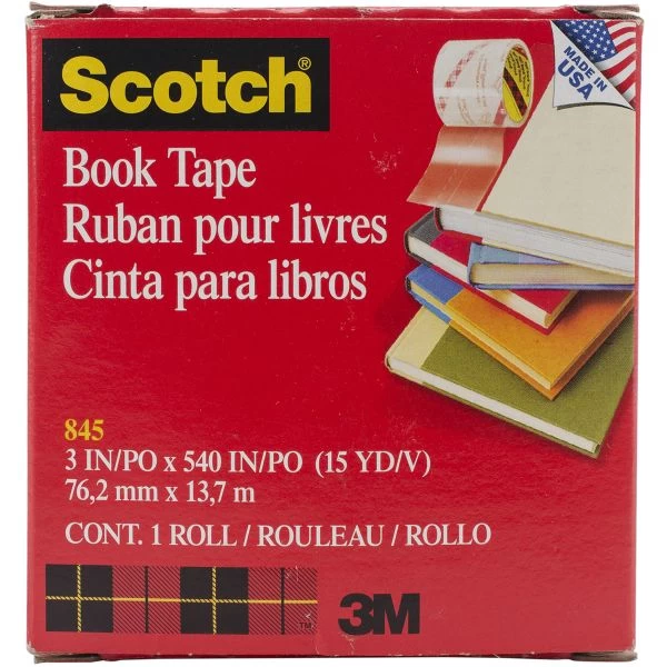 Scotch Book Tape Boxed – 3M-Scotch Book Repair Tape: White. Perfect for repairing, reinforcing, protecting and covering bound edges and surfaces of books and other paper materials. Prolongs the life of your books, magazines and more! Tape is transparent. This package contains 15 yards of 3 inch wide Scotch book repair tape. Made in USA.