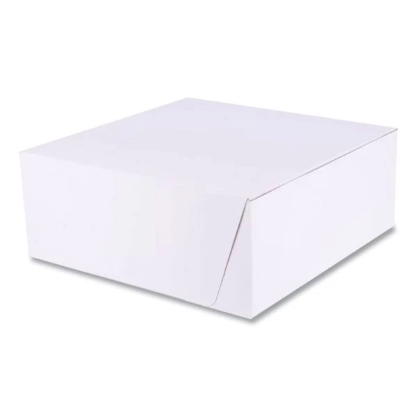 SCT White One-Piece Non-Window Bakery Boxes, Standard, 10 x 10 x 4, White, Paper, 100/Bundle – The bakery box is made from high quality paperboard that is white on the outside and Kraft on the inside. Perfect for cakes, pastries, pies and cupcakes. The white, clay-coated exterior accepts a printed logo or business name. Each one-piece box ships flat for transport and storage, but assembles easily into a folded carton with lock-corner closures and a tuck top to secure contents.