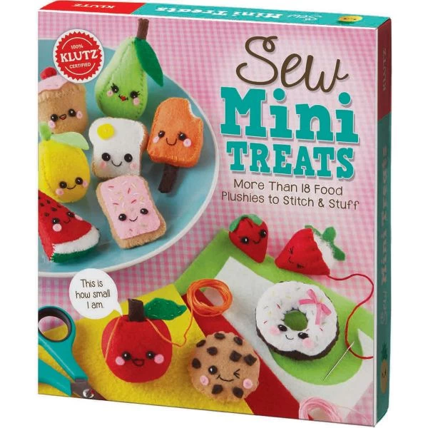 Sew Mini Treats Book Kit – Klutz-Sew Mini Treats Book Kit. Make your own felt food with fabulous faces! This package contains one book with over eighteen designs, three paper pattern pages, twelve sheets of acrylic felt, 32 yards of cotton floss in eight colors, thirty precut acrylic felt eyes and cheeks, two embroidery needles and 1oz of polyfill stuffing. Softcover, 48 pages. Published Year: 2016. ISBN 978-0- 545-90652-4. Imported.