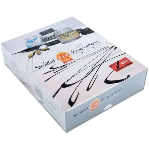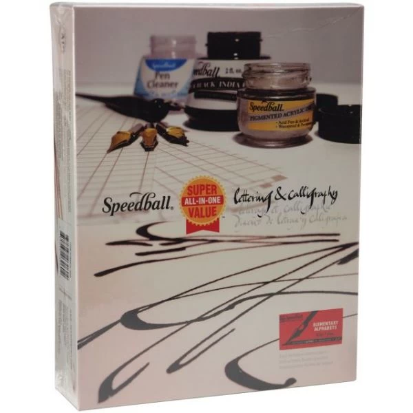 Speedball Lettering & Calligraphy Kit – SPEEDBALL-Super All-In-One Lettering & Calligraphy Set. Includes the essentials needed to get started in lettering and calligraphy. Perfect for beginners, students or calligraphers. Fun and easy to use. Perfect for scrapbooks, journals, drawing, sketching, and much more. Kit contains: Kit includes one each of the following: C1 nib, C2 nib, B4 nib, A5 nib, penholder, 2 oz. Super Black India Ink, 12 ml metallic silver calligraphy ink, 2 oz. highly effective pen cleaner, practice paper, Speedball Elementary Alphabets Instructions booklet. Measurements: 8-3/4×6-3/4×2 in. Made in USA.