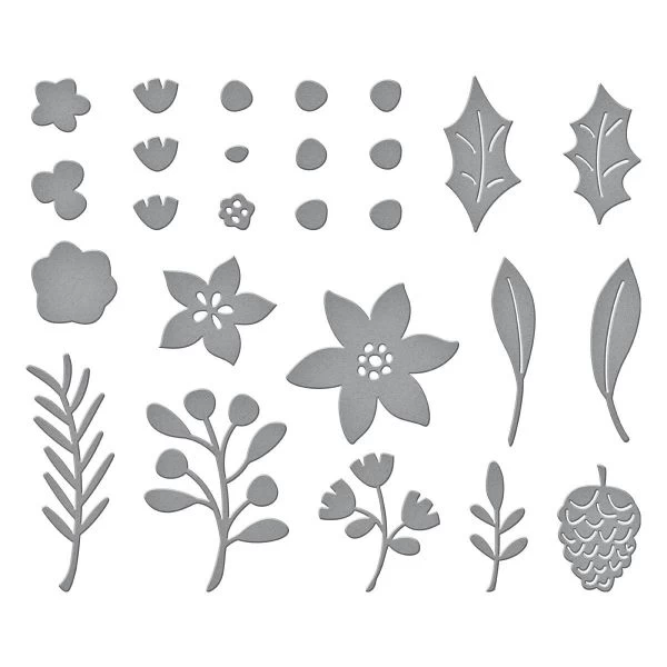 Spellbinders Etched Dies From The Make It Merry Collection – Make It Merry Florals. Etched Dies are from Make It Merry Christmas. The set of 13 thin metal cutting dies makes many different combinations of holiday botanical accents and clusters for your seasonal projects. Shapes include Poinsettia blooms, sprigs, pinecone, and various leaves. What will you create with these florals? Approximate Size: Poinsettia LG: 1.50 x 1.50 in./3.80 x 3.80 cm Poinsettia SM: 1.00 x 1.00 in./2.50 x 2.50 cm Flower: 0.80 x 0.80 in./2.00 x 2.00 cm Pinecone: 0.75 x 1.10 in./1.90 x 2.80 cm Berry Sprig: 1.40 x 1.75 in./3.60 x 4.40 cm Flower Sprig: 1.00 x 1.20 in./2.50 x 3.00 cm Tall Sprig: 0.75 x 2.10 in./1.90 x 5.30 cm Short Sprig: 0.50 x 1.15 in./1.30 x 2.90 cm Holly Leaves: 0.70 x 1.25 in./1.80 x 3.20 cm Leaves: 0.40 x 2.25 in./1.00 x 5.70 cm. Imported