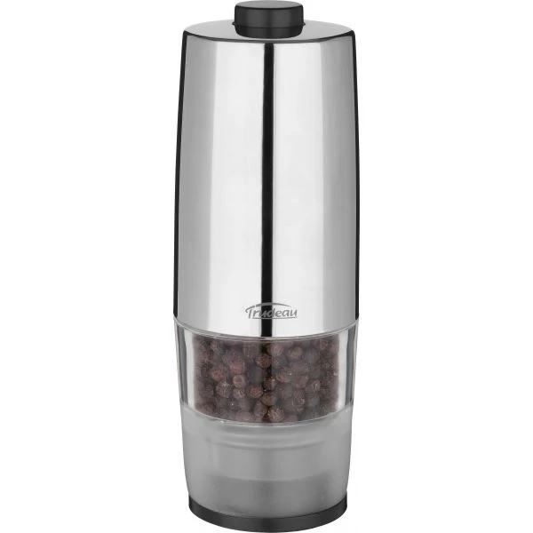 Stainless Steel One Hand Battery Operated Pepper Mill 6″ – A stylish pepper grinder with clear base and one-touch operation. Adjustment knob for fine or coarse grind. The ceramic grinder will never rust, so grinder can be used with salt also. Grinder runs on four AAA batteries (not included). Package contains one battery operated grinder with pepper. Imported.