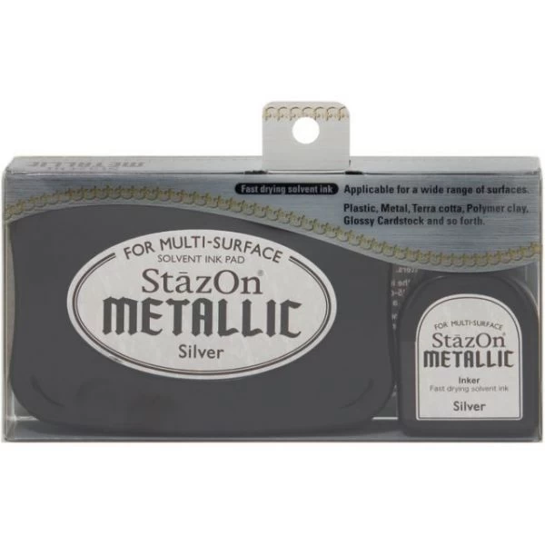 StazOn Metallic Solvent Ink Kit – This kit contains one blank ink pad and one bottle of StazOn Metallic Inker. For use on a wide variety of surfaces including plastic, metal, polymer clay, glossy cardstock, and more. This ink is acid-free, archival, fast-drying and available in a variety of metallic shades: each sold separately. Imported.