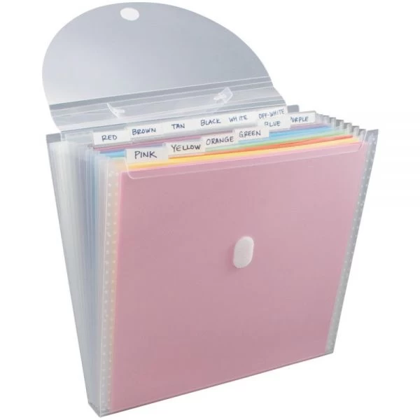 Storage Studios Expandable Paper Organizer – Organize over 200 sheets of 12×12 inch paper with ease! There are twelve tabbed pockets with labels included and a convenient sliding lid for easy paper access. This package contains one 13-1/4×1- 3/8×13-1/8 inch clear paper organizer with an attached handle and twelve white labels. Imported.